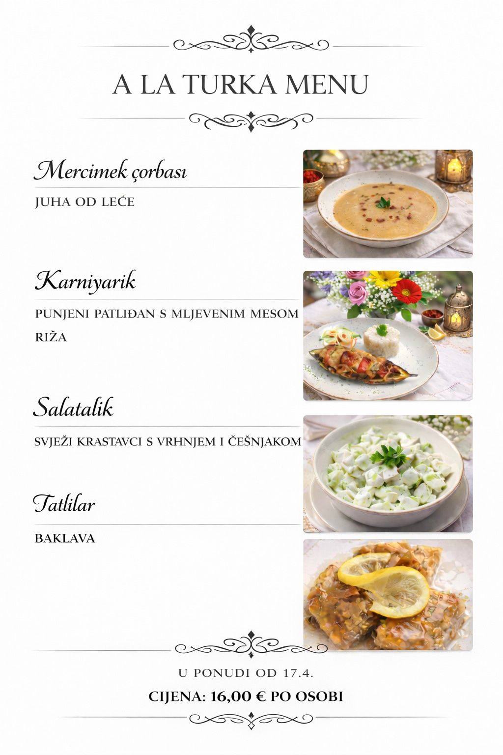 Restoran i pivnica Stari grad donosi novi A la turka menu od tri slijeda: predjelo, glavno jelo i desert, osmišljen kao prava turska priča. Svaki tanjur nosi snagu, karakter i iznenađenje, baš poput legendarne dosjetke koja je spasila grad.