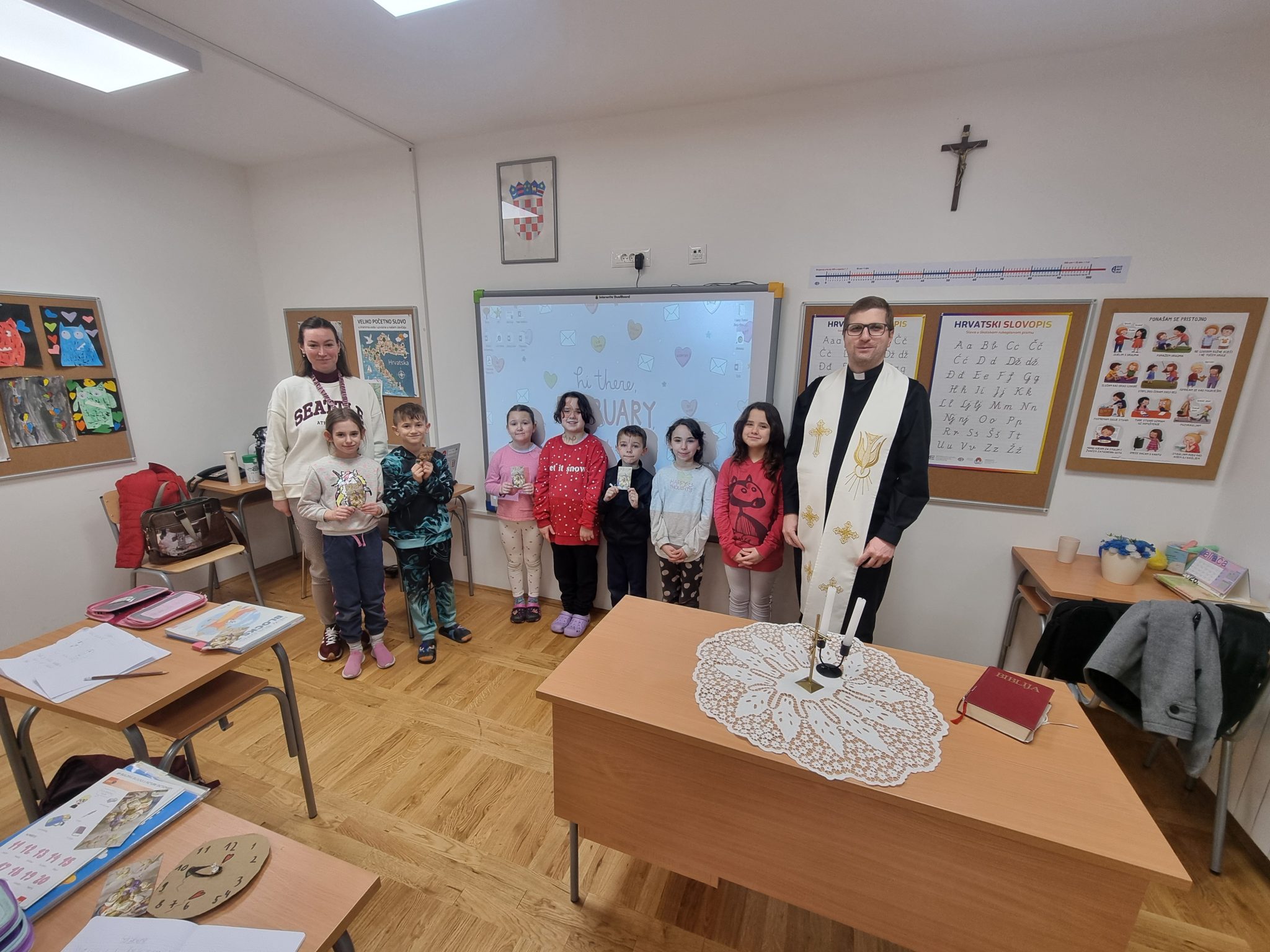 Velečasni je pozdravio učenike, vjeroučiteljicu te učiteljice Klaru Kuštro, Olgu Lazar i Dariju Car, zahvalivši na lijepom dočeku i zajedništvu.