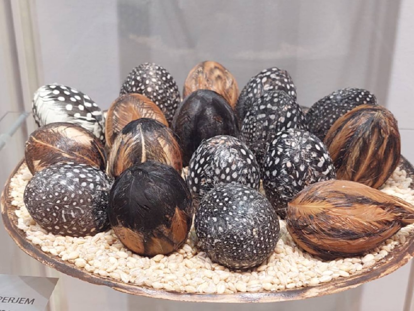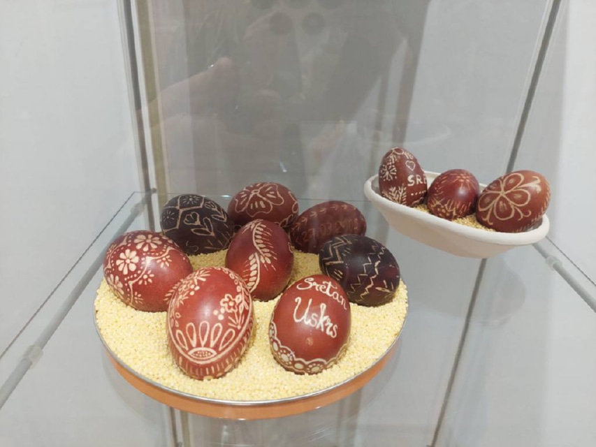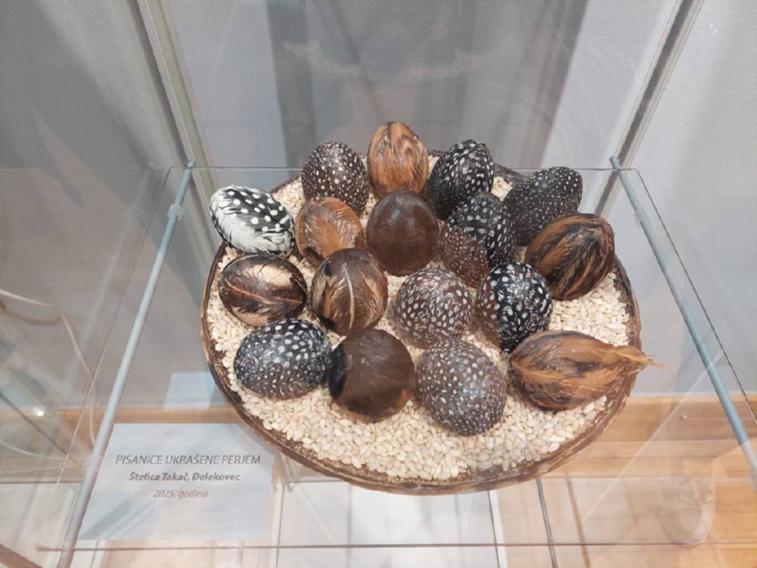 Izložena je tradicionalna zaštićena prepisanka, rad Branke Sabol i Jasne Puhar, zatim pisanica pisana voskom, rad Ljubice Celiščak te pisanice u perju, rad Štefice Takač. Tu je i pisanica u boji od ljusaka luka i grebana kiselinom autorica Amalije, Petre i Kristine Kadija, kao i pisanica obučena u platno posebnom tehnikom, koju je izradila Sabina Matiša.
