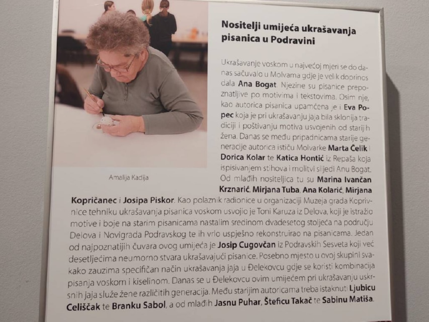 – U sklopu postavljene izložbe, tijekom uskrsnog vremena, u Galeriji će se održati i radionice, a naše vrijedne čuvarice tradicije Branka Sabol, Jasna Puhar, Antonia Sirutka i Sabina Matiša za sve zainteresirane svoj način rada pokazat će na radionici u srijedu, 23. travnja u 18 sati – objavila je Općina Đelekovec.