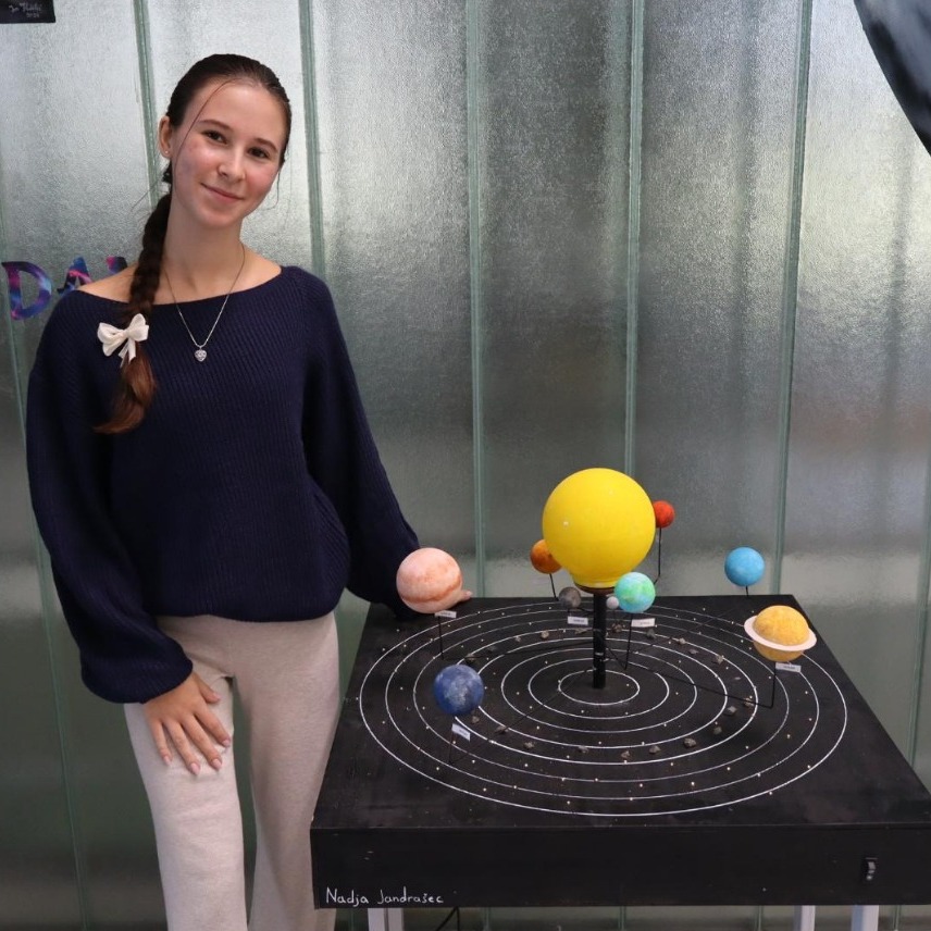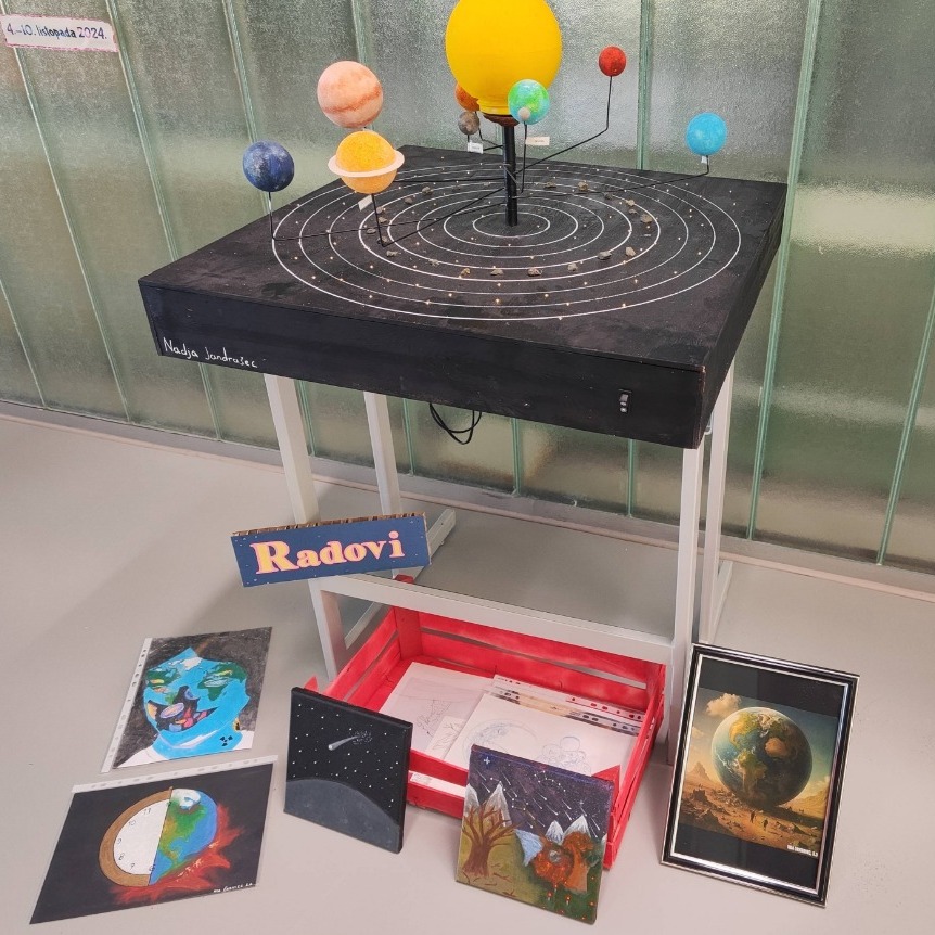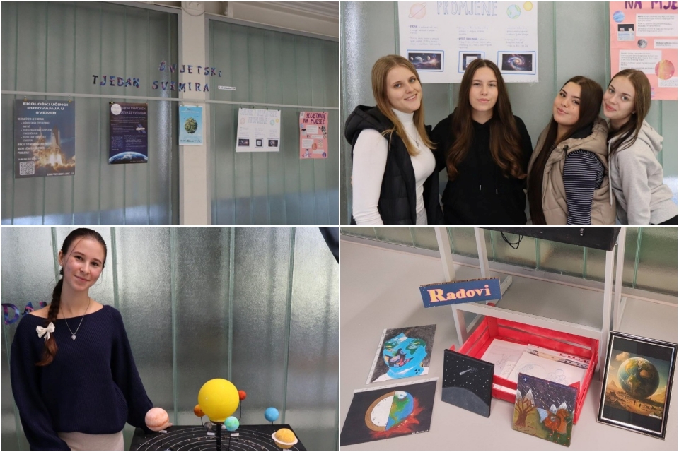 – Tako su učenici 2.d i 3.c razreda pod mentorstvom nastavnika fizike Marka Vargovića Svjetski tjedan svemira obilježili izradom plakata o svemiru i klimatskim promjenama. Pod mentorstvom nastavnice fizike Željke Perošić učenice Iva Hodalić i Lea Vrhoci iz 3.a te Mia Krofl iz 3.g o zadanoj su temu naslikale slike. Učenica 3.g Nadja Jandrašec izradila je maketu Sunčeva sustava koja je s ostalim radovima bila izložena u hodniku škole. Učenice Nadja Jandrašec, Ana Šimunija i Petra Salajpal iz 3.g izradile su modele zvijezda od recikliranog kartona kako bi uz izložene radove ilustrirale zviježđe Oriona. Ujedno, učenice su ilustrirale i zviježđe Raka – ističu u školi i dodaju da si im u svemu pomagale i učenice Tara Vrabec iz 3.g i učenice Sara Višak, Lana Jaković, Martina Forjan, Ivona Međimorec i Korana Grgac iz 3.d.