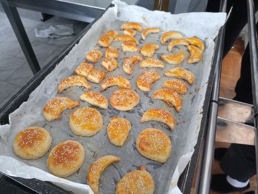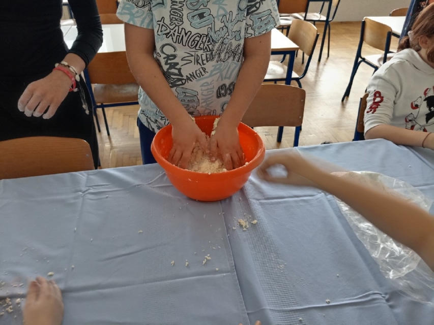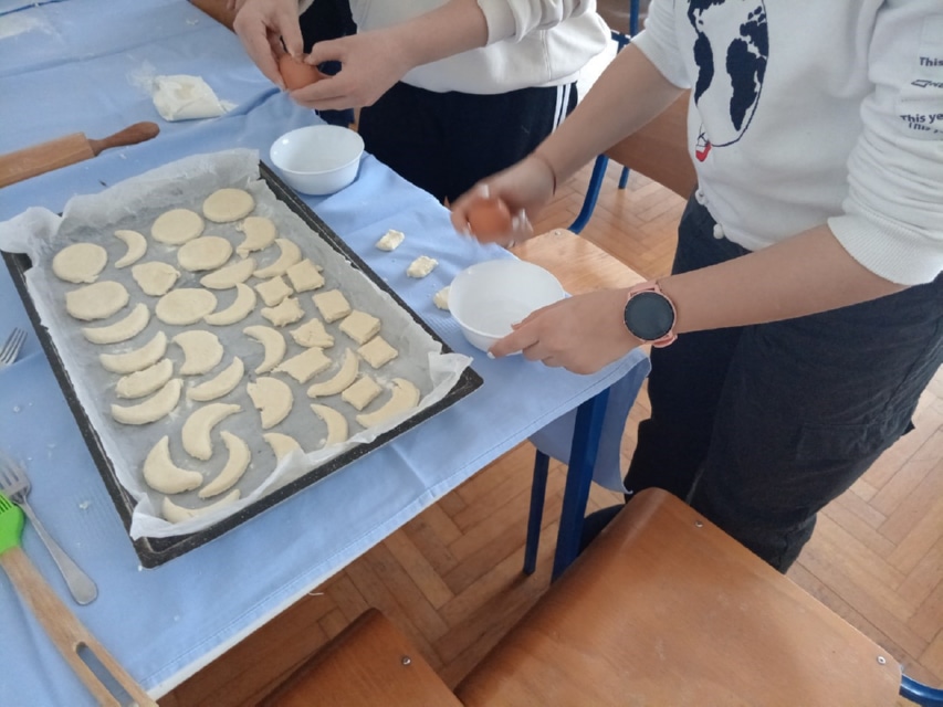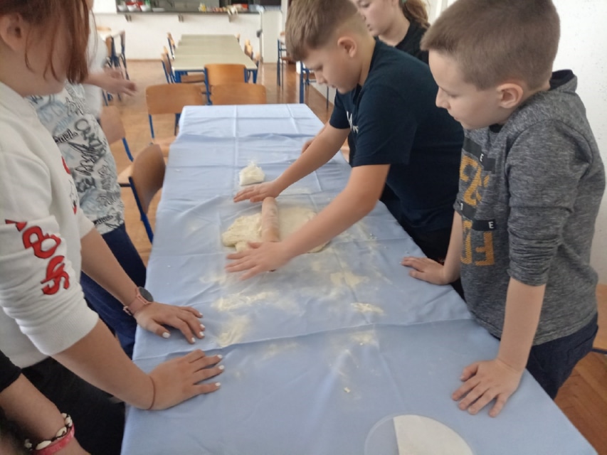 – Najprije su nasjeckali margarin i puter te su usitnili sir. Sve skupa su to stavili u zdjelu te dodali brašno i sol. Navedene sastojke su izmijesili, a dobiveno tijesto su prešli valjkom, nakon čega su ga oblikovali čašama i noževima. Na tijesto su kistom nanesli žumanjke i prosuli ga sezamom. Na kraju je školska kuharica pogačice stavila u peć te ih ponudila učenicima i učiteljima – javio je Ištvan.