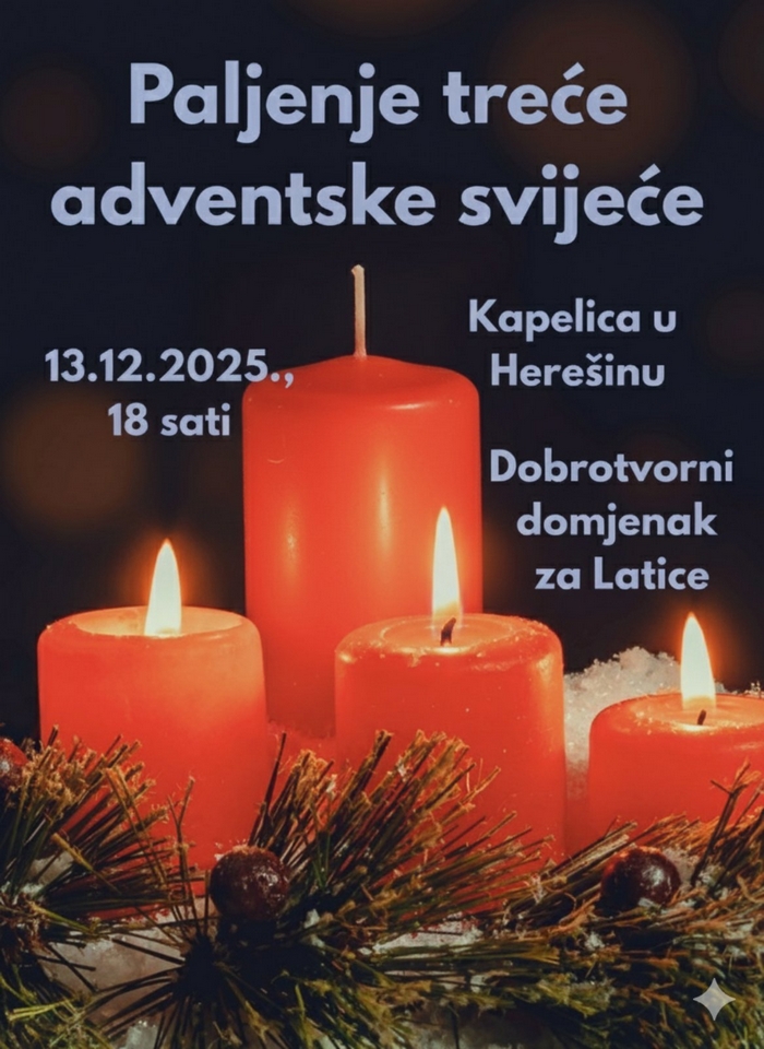 Mještani koprivničkog prigradskog naselja Herešin u subotu će upaliti treću svijeću na adventskom vijencu, a tim će povodom prikupljati i novčana sredstva za potrebe Udruge za pomoć osobama s intelektualnim teškoćama Latice.