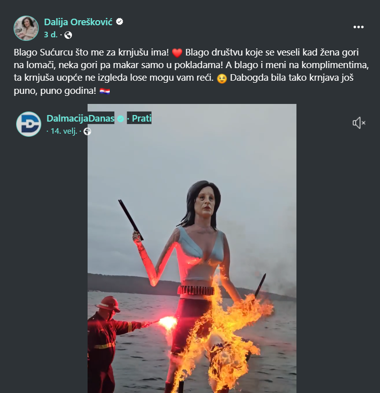 – Blago Sućurcu što me za krnjušu ima! Blago društvu koje se veseli kad žena gori na lomači, neka gori pa makar samo u pokladama! A blago i meni na komplimentima, ta krnjuša uopće ne izgleda loše mogu vam reći. Dobogda bila tako krnjava još puno, puno godina – napisala je Orešković.