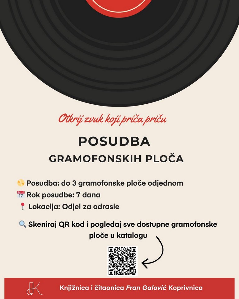 – Od sada je moguća posudba gramofonskih ploča – do tri ploče na rok od sedam dana. Zbirka obuhvaća razne glazbene žanrove i stilove – od rocka i alternative, jazza i bluesa, preko popa, elektroničke glazbe, do soundtrackova te domaće i regionalne produkcije. Zavirite u katalog i pronađite nešto za sebe – poručuju iz knjižnice.