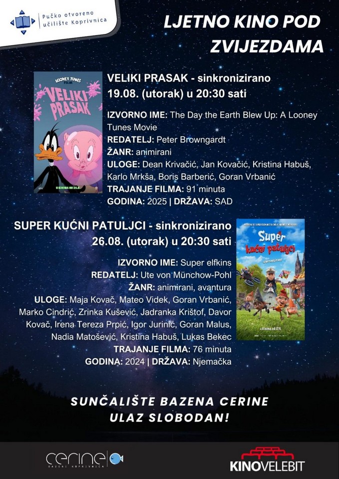 Ljetno kino na Cerinama nije samo projekcija filma, to su trenuci smijeha, opuštanja i druženja. Ponesite dobro raspoloženje i dopustite da vas veliki ekran povede u svijet čarolije pod zvijezdanim nebom.