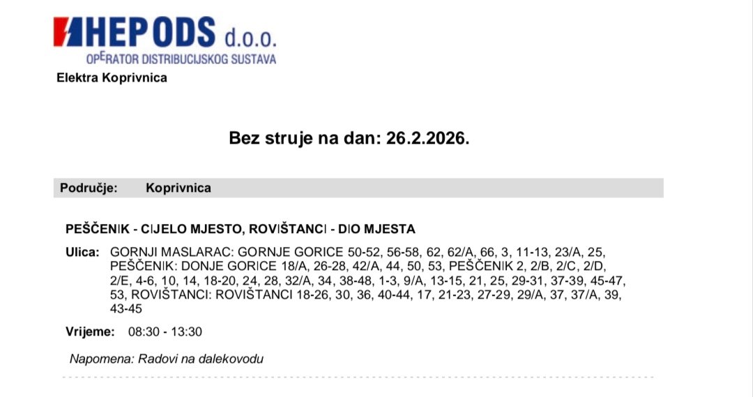 Elektra Koprivnica izvijestila je da sutra neće biti struje u Peščeniku i Rovištancima.
