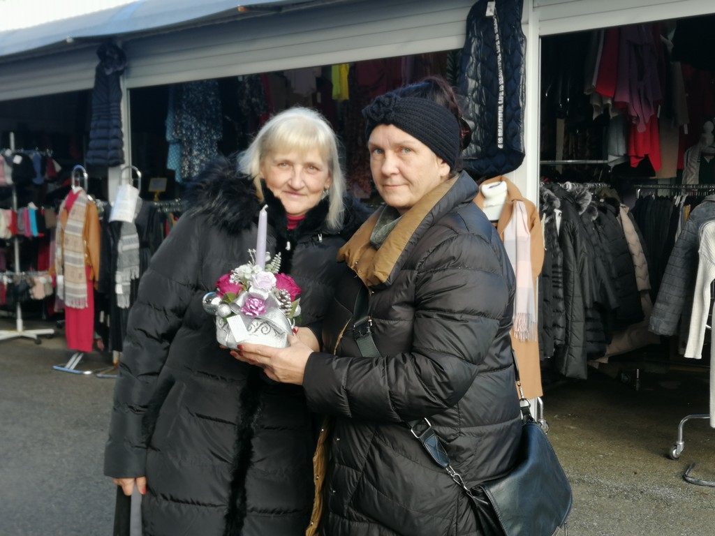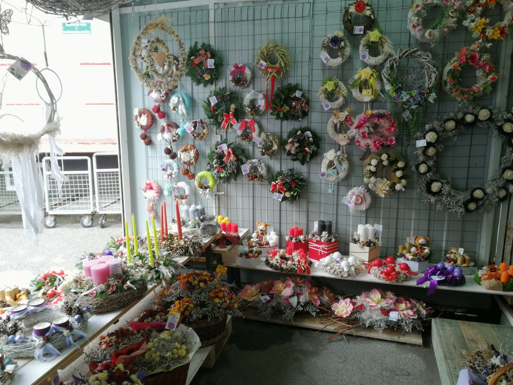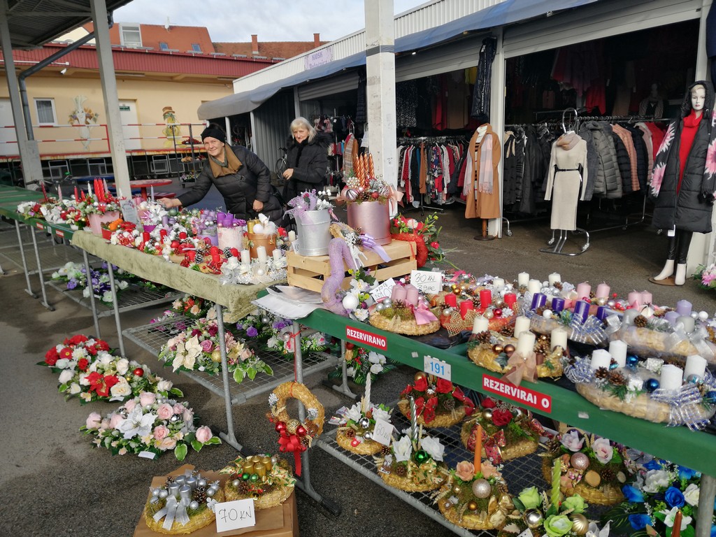 Pažnju su nam privukli vijenci izrađeni od suhog cvijeća iz cvjećarnice Pušlek vlasnice Anite Harambašić koja nam je kazala kako se ljudi sve manje pripremaju za Božić te kako velika većina sama izrađuje vijence i advente. Inače, Anita se od 1997. godine bavi izradom vijenaca, aranžmana i raznih kućnih dekoracija, a cvjećarnicu na tržnici ima od 2003. godine.