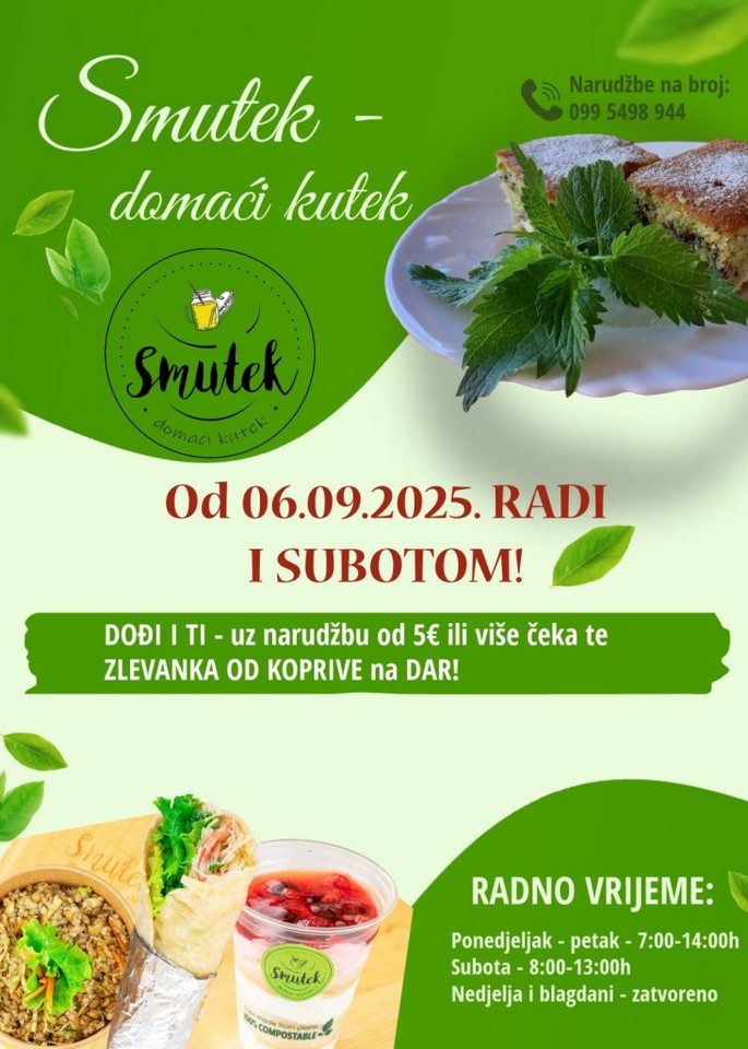 Kako bismo zajedno obilježili povratak subotnjeg druženja u Smuteku, sve goste koji toga dana ostvare kupnju u iznosu od 5 eura ili više nagrađujemo domaćom zlevankom s koprivom.