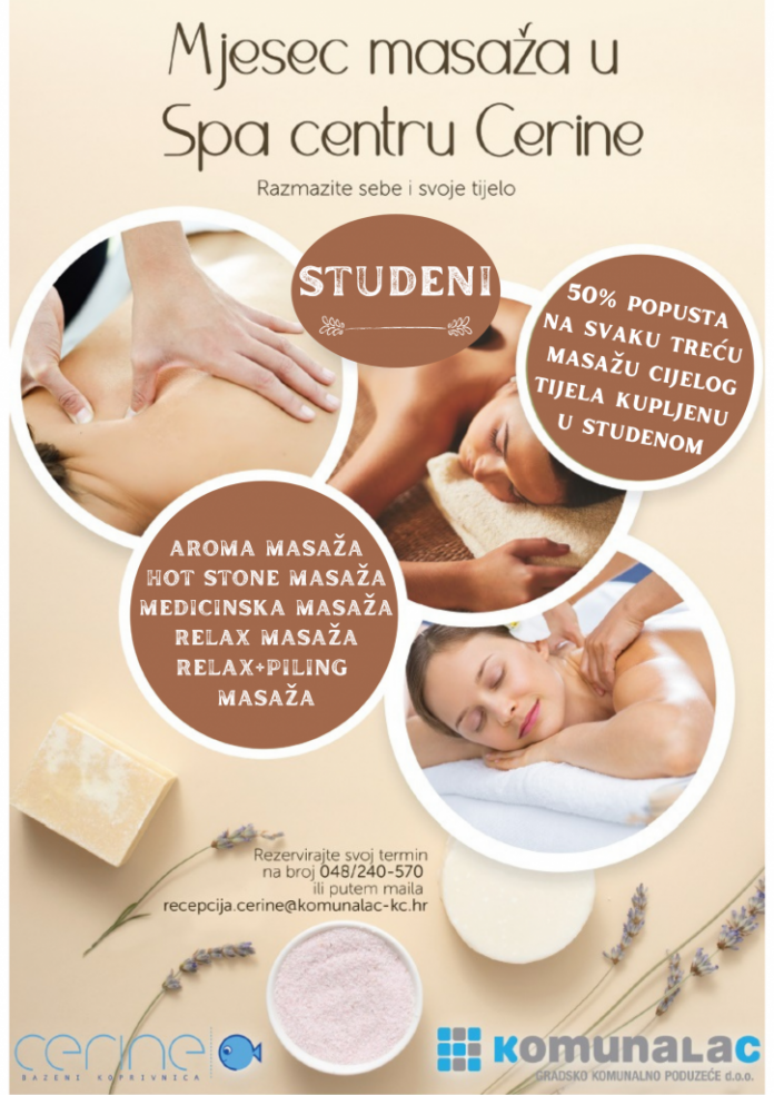 Vrijeme je za opuštanje, a što je bolje za opuštanje od masaže cijelog tijela pod vodstvom iskusnih terapeuta Wellness&Spa zone Bazena Cerine, poručili su iz Cerina te dodali kako su ovog studenog pripremili odlične masaže po još boljim cijenama. Tako ćete za svaku treću masažu cijelog tijela uplaćenu u studenom dobiti 50 posto popusta, a iskoristiti je možete do kraja godine.