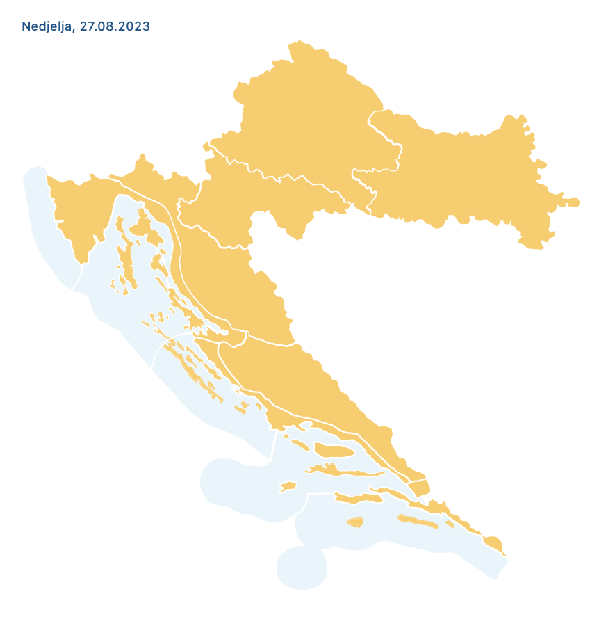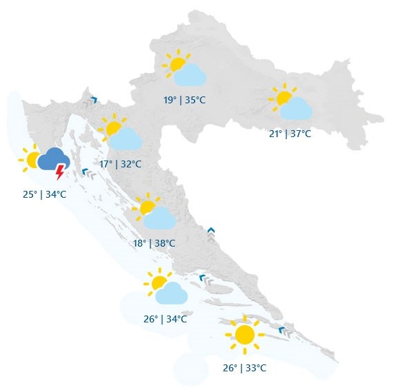 Vjetar slab i umjeren jugozapadni, na Jadranu slabo i umjereno, navečer mjestimice i jako jugo. Najviša dnevna temperatura zraka većinom između 32 i 37 stupnjeva, piše DHMZ.